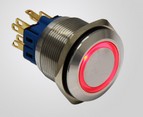 Interruttore stagno IP65 28mm acciaio inox, ring led colore Rosso 12V, contatto 1 NA 1NC 5A 250V terminali a saldare o faston 2,8x0,5.